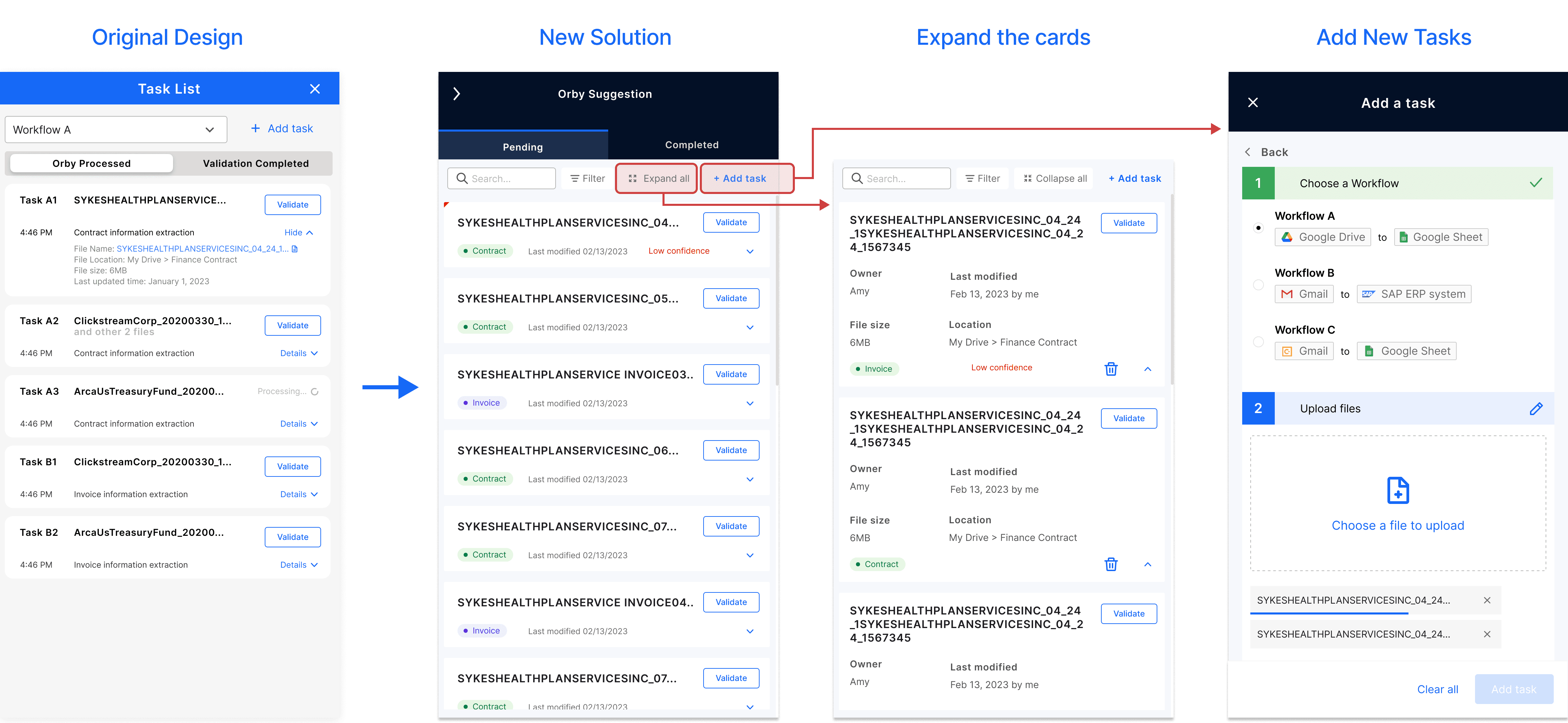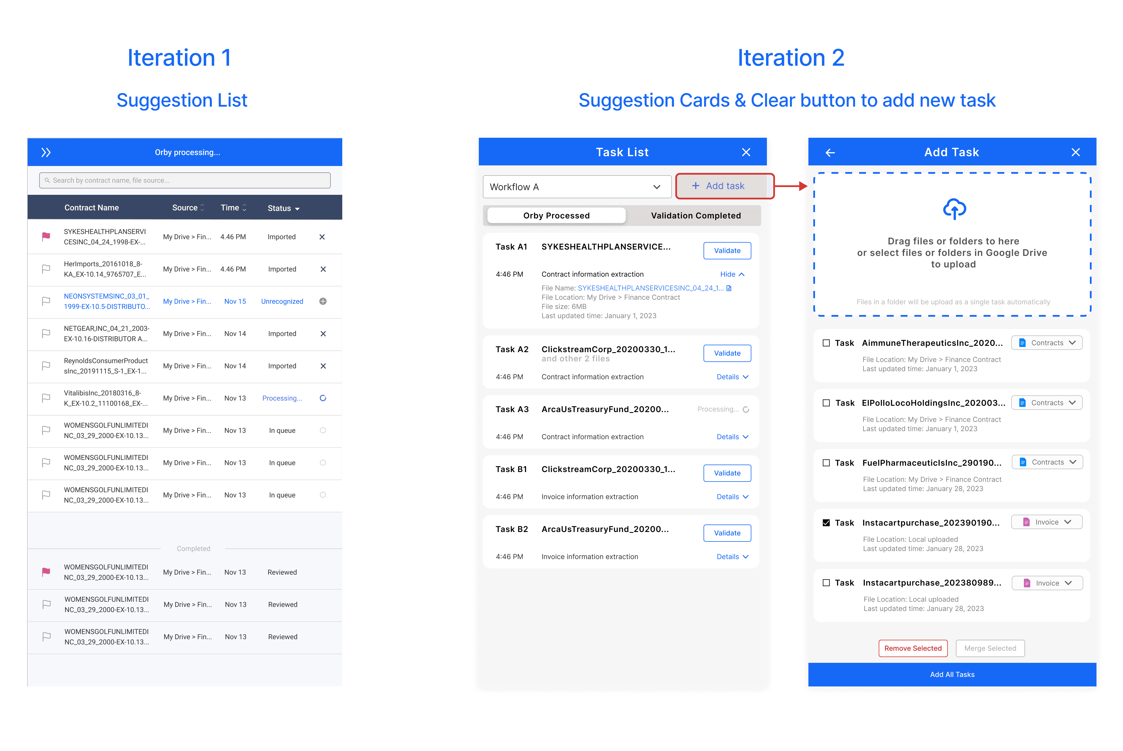 To reduce task overload, we introduced a Smart Suggestion Panel that prioritizes tasks based on urgency and impact. Automatic file syncing streamlines workflow, while manual task addition gives users full control. Users can start with Orby’s suggestions or add tasks manually.
