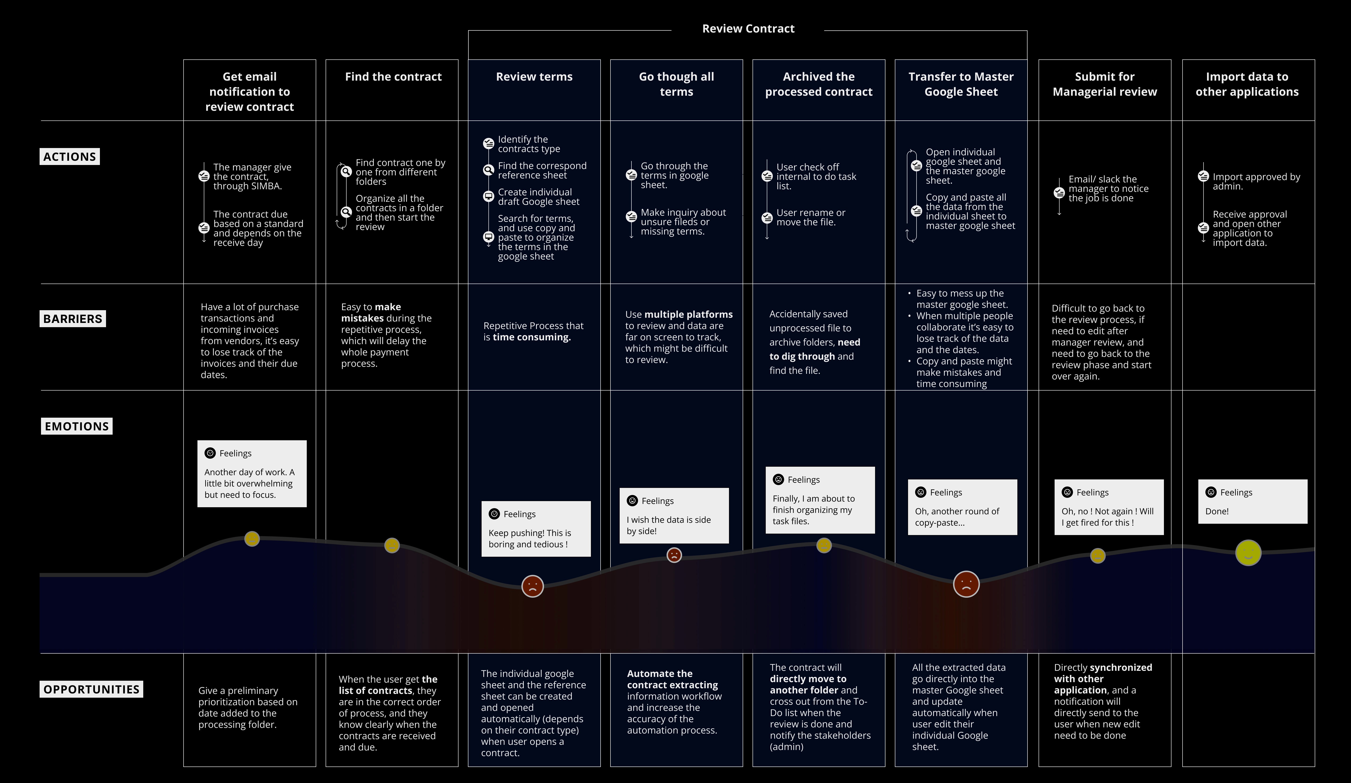 We use the research findings to create a journey map, identifying opportunities for future design. (SIMBA is the team’s internal document management platform; for design purposes, we used Google Drive as an alternative.)