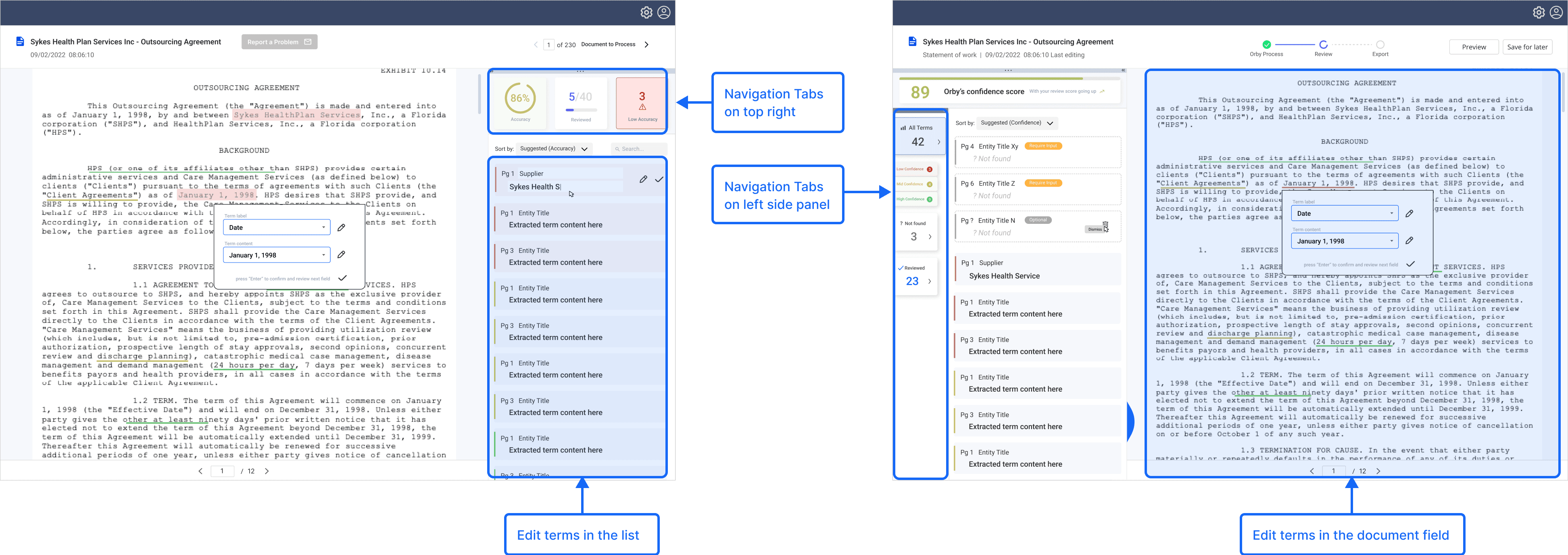Clear Navigation: Users need a clearer navigation pattern between the key terms checklist and the documents.