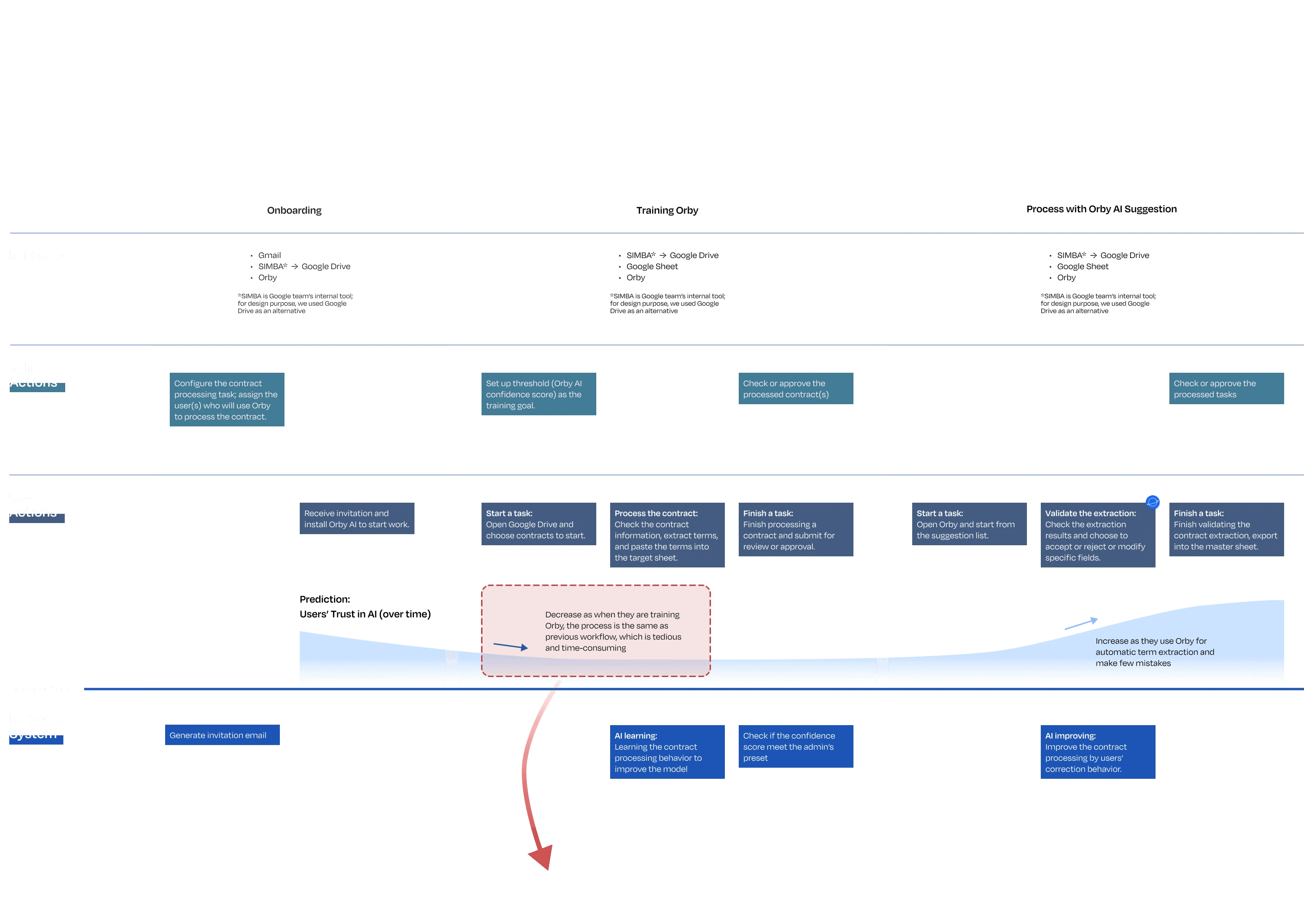 According to the developers, the users need to process 100~200 contracts to finish the training process. The service blueprint helped us generate our first design question.